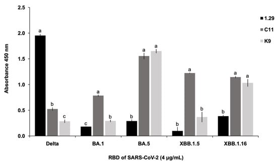 Evaluation of the antigen-binding activity of the Nbs isolated using FLI-TRAP. The abilities of the 1.29, C11, and K9 Nbs to bind to a range of RBDs of the Omicron subvariant BA.5 and a few other Omicron variants were examined using enzyme-linked immunosorbent assay (ELISA) and microscale thermophoresis (MST). Redirecting the 1.29 Nb toward the RBD of Omicron subvariant BA.5 revealed a significant increase in binding activities for the C11 (OD450 = 1.5544 ± 0.0619) and K9 Nbs (OD450 = 1.6508 ± 0.0392) compared to the 1.29 Nb (OD450 = 0.2906 ± 0.0312) (Figure 4). Additionally, the binding activities of all Nbs against the Delta and BA.1 variants were also evaluated, as the 1.29 Nb has been reported to bind strongly to Delta but not to BA.1 []. The results confirmed that the 1.29 Nb remained functional when expressed in this study since it produced a high ELISA signal to Delta but not to BA.1, as expected.