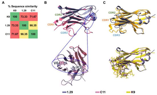 A comparison of the amino acid and structural similarity of Nbs. (A) Amino acid sequence similarity among all Nbs. Structural similarity of Nbs; alignment of the 1.29 Nb compared to (B) the C11 Nb and (C) the K9 Nb. The purple, pink, and yellow colors represent 1.29 Nb, C11 Nb, and K9 Nb, respectively.