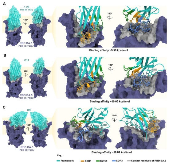 The crystal structures of the RBD of BA.5 variant (PDB ID: 7ZXU) and the original 1.29 Nb (PDB ID: 7R4Q) were obtained from the PDB Protein Data Bank (https://www.rcsb.org/, accessed on 25 February 2024). The structure of the C11 Nb was prepared using site-directed mutagenesis at R38C and V64E of the parental 1.29 Nb via Discovery Studio software version 21.1. The K9 Nb (as its CDRs differ significantly from the 1.29 Nb) and RBD of JN.1 variant were modeled on the AlphaFold2 online server (https://colab.research.google.com/github/sokrypton/ColabFold/blob/main/AlphaFold2.ipynb, accessed on 26 February 2024) [,] (see sequence alignment in Figure S3). To prepare the optimal initial structure of the RBD and Nbs, energy minimization was performed using the AMBER ff14SB force field []. This involved docking the RBD of BA.5 variant with all 3 Nbs using a blind docking method through HDOCK (http://hdock.phys.hust.edu.cn/, accessed on 26 February 2024) [,]. Subsequently, RBD–Nb complexes were energetically minimized by the AMBER ff14SB force field, aiming for the complexes with the lowest binding energy. This process aligned the torsion angles of complementary amino acid side chains between the RBD of BA.5 variant and Nbs, ensuring uniformity in the lowest binding energy and preventing any atomic misalignment. HDOCK was employed to perform the redocking of the optimized RBD and Nb, yielding the optimal docking score and interaction []. In the final step, the binding affinities of the RBD–Nb complexes were calculated by rescoring using AutoDock Vina [].