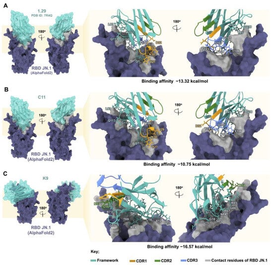 Prediction of the binding affinity of Nbs when interacting with the RBD of JN.1 variant. In late 2023, JN.1 (BA.2.86.1.1), a descendant of the Omicron subvariant BA.2.86, emerged and rapidly became predominant in France. This variant exhibits alterations in the spike protein at a specific location, thereby enhancing its ability to evade immunity compared with BA.2.86 []. As of February 23, 2024, the GISAID database shows that JN.1 variant has become the predominant strain, with 86.0–96.0% GRA in the top 10 countries in the past 4 weeks []. We were interested in exploring the potency of the 1.29, C11, and K9 Nbs and their potential interaction strengths with the RBD of JN.1 variant by prediction using molecular docking. Both the 1.29 and C11 Nbs could interact with the RBM of the RBD of JN.1 variant in a manner similar to that of BA.5 variant, by adopting the same interaction posture. Figure 7 illustrates the posture of the 1.29 and C11 Nbs, which allowed for interactions between CDR1 and CDR3 with the RBM of JN.1 variant (as shown in Figure S8). Moreover, both Nbs could bind to the RBD of JN.1 variant with higher interface residues and interface area than for BA.5 variant (Figure S6), resulting in more interactions and a higher binding affinity. Figure 7 confirms that both the 1.29 and C11 Nbs demonstrated a higher binding affinity to JN.1 variant (−13.32 and −10.75 kcal/mol, respectively) than to BA.5 variant. This can be attributed to the presence of E484K, a key mutation amino acid in JN.1 variant, which introduced a positive charge. This positive charge facilitated a strong salt bridge interaction (Figures S7 and S9) with Asp45, thereby affecting their structural fit. The E484K mutation has been reported to reduce neutralization []. It should be noted that this mutation is present in the Beta and Gamma variants and that the 1.29 Nb was reported to be able to bind to these variants []. Additionally, both the 1.29 and C11 Nbs had a lower number of hydrogen bond interactions while exhibiting a higher number of non-contact interactions with JN.1 variant compared to BA.5 variant (Figure S6).