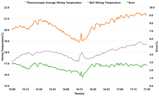 The function of the mixing chamber installed in the air handling unit (AHU) is to mix outdoor air (OA) and return air (RA). While the mixing of the two types of airs is generally assumed to be perfect, in reality, incomplete mixing occurs inside the mixing chamber [3]. This causes errors in the mixing temperature measurement. Most mixing chambers have only one mixing temperature sensor inside them, which makes it difficult to measure the exact mixing temperature [4]. Therefore, we conducted a preliminary experiment to check the mixing temperature errors that occur during the operation of the AHU. For this, 15 thermocouple sensors were equally spaced and installed inside the mixing chamber to check the mixing temperature errors obtained with the existing mixing temperature sensor found inside the mixing chamber. The thermocouple-measured mixing temperature shown in Figure 1 indicates the average temperature measured by the 15 thermocouples. The average error between the average thermocouple-measured mixing temperature and the temperature measured by the building automation system’s (BAS) mixing temperature sensor was about 2.438 °C.