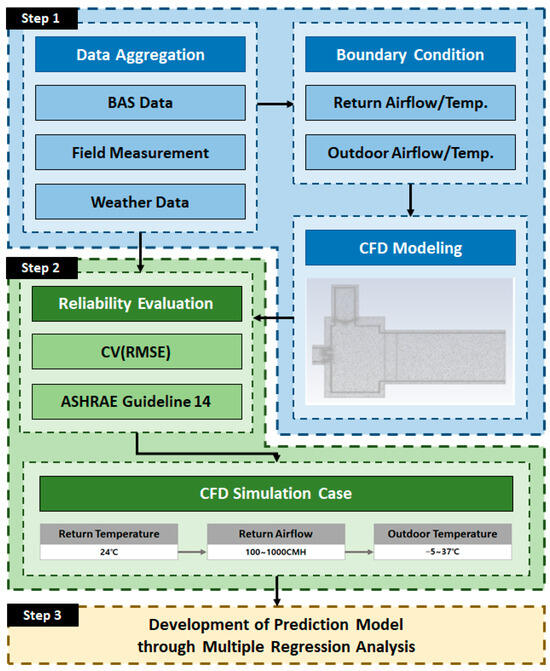 - Step 2: In this step, simulations were carried out by substituting the boundary conditions, and the temperature distribution results obtained through the modeling process and those of the actual data were compared to evaluate the reliability of the model. This reliability evaluation approach was based on the criterion that a coefficient of variation (CV) of the root-mean-square error (RMSE) of less than 30% is considered reliable according to Guideline 14 of the American society of heating, refrigerating and air-conditioning engineers (ASHRAE) [9]. After the reliability evaluation, a total of 60 CFD simulation cases were tested according to return airflow, return temperature, outdoor airflow, and outdoor temperature to develop a mixing temperature prediction model.