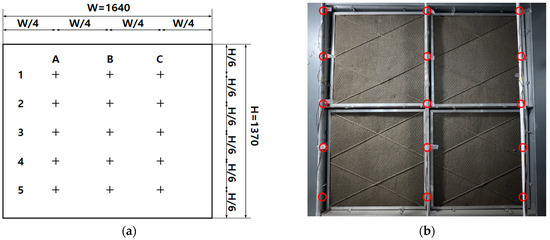 The experiment was conducted in March 2024, which included collecting temperature data for the inside of the mixing chamber. Data Logger 34970A 4.3 (Keysight Technologie, Santa Rosa, CA, USA) was used to measure the temperature points for the inside of the mixing chamber; the equipment specifications are provided in Table 2. The GDT-420 was the temperature measurement sensor installed inside the mixing chamber and is shown in Figure 4a on the left side of 1A. Figure 4b displays the installation locations of the thermocouple temperature measurement on the inner cross section of the mixing chamber. In addition, the measurement point is a thermocouple installed at a distance of 150 mm from the wall. The thermocouples were installed at 15 points that were equally spaced across the cross section of the mixing chamber. Measurement points 1A–1C are the temperature measurement points where outdoor air is introduced from the top, while measurement points 3A–3C are the temperature measurement points where return air is introduced from the front. A tool was made to aid with thermocouple installation, and the thermocouples were installed as shown in Figure 4b. The storage frequency for the temperature data was set to one minute, and the data were transferred to a computer through the data logger software.