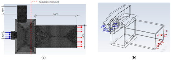 Ansys Fluent 24.1, a CFD program, was used to develop a mixing temperature prediction model for a single-duct VAV system. The modeling was implemented as 450 mm × 450 mm for the outdoor air cross section, 1200 mm × 400 mm for the return air cross section, 1400 mm × 1000 mm for the exit cross section, and 2000 mm for the exit length. As boundary conditions for the reliability verification, the boundary conditions obtained through the experiment were used: an outdoor airflow of 483.41 CMH and outdoor temperature of 10.833 °C, and a return airflow of 522.4 CMH and return temperature of 24 °C. For CFD simulation, the mixing chamber was modeled in three dimensions using SpaceClaim 24.1. Next, Fluent Meshing was used to form the grid for the simulation before Fluent Solution was used to run the simulation with the boundary conditions. As shown in Figure 5a, the grids were polyhedral, with a maximum size of 20 mm. Figure 5b is a 3D model of a mixing chamber. The number of lattices was modeled to be about 2,000,000, and the simulation cross section was A-A’. The CFD simulation conditions were governed by the pressure-based solver, which solved the subsonic range as shown in Table 4. The gravity value was set and the simulation was performed in the steady state. The humidity was not considered and the turbulence model was solved using standard k-ε [13,14]. The convergence criterion was set based on the residual value of each calculation step and was set to or less for continuous equations, X-Y-Z velocity, k and ε, and or less for energy.