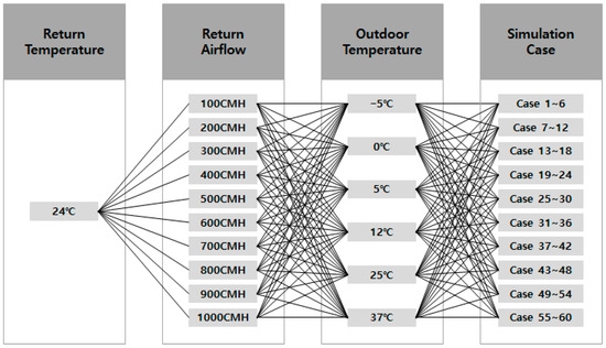 The aim of this study was to develop a mixing temperature prediction model, which was carried out using Ansys Fluent 2024 R1. The simulation case employed for the development of the prediction model was determined after the return temperature was fixed at 24 °C, and the mixing temperature prediction model was presented and verified after the CFD simulation of the cases was carried out according to return airflow, outdoor airflow and outdoor air temperature. Figure 6 categorizes the CFD simulation cases according to return temperature, return airflow rate and outdoor air temperature. The return temperature was kept constant at 24 °C, while the outdoor air temperature was set using seasonal temperature data. For the airflow, the damper opening rate was calculated based on the requirement of 70% return air and 30% outdoor air, and the outdoor airflow was calculated based on the return airflow using the law of the conservation of mass, which is represented by Equation (9). The range for the return airflow was divided into 100CMH steps to set the airflow conditions from 100 to 1000CMH. The CFD simulation was performed by setting boundary conditions according to these airflow conditions.