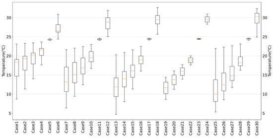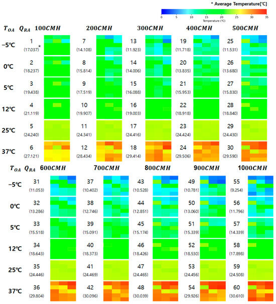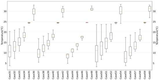 The measurement points used in the CFD simulation were set to be the same as those used during the experiments to extract the data. Figure 7 displays a heat map of the temperature distribution for each CFD simulation case. Figure 8 shows a graph that presents the temperature data from Figure 7 in the form of a boxplot. It can be seen that the temperature distribution in Cases 5, 11, 17, 23, 29, 35, 41, 47, 53, and 59, which are cases where the outdoor air temperature and the temperature of the air entering the mixing chamber were similar, tends to narrow. This indicates that the smaller the difference between the outdoor air temperature and the airflow temperature, the more uniform the temperature distribution inside the mixing chamber. Conversely, the larger this temperature difference is, the wider the temperature distribution in the mixing chamber would be, which can affect the measurement of the AHU’s mixing temperature sensor. If the airflow rate in the mixing chamber is high, the mixing temperature tends to decrease when the outdoor air temperature decreases, whereas the mixing temperature increases when the outdoor air temperature increases. The mixing temperature derived from the CFD simulations was used as the average value of the temperature measured at the 15 points.