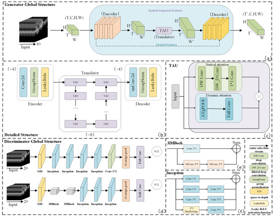 The translator is predominantly composed of stacked temporal attention units, as depicted in Figure 1b, with the specific configuration of the TAU illustrated in Figure 1c. The discriminator comprises both a temporal discriminator and a spatial discriminator, with its detailed structure presented in Figure 1d. This structure primarily incorporates 3D convolution (3D Block) modules [23], spatial-to-depth (S2D) [24] modules, and inception modules. The internal architecture of the 3D Block module is depicted in Figure 1e. The inception module [25], shown in Figure 1f, represents a type of neural network that integrates convolutional kernels of varying sizes, thereby enabling the model to concurrently process features at multiple scales. The operational principle of the model is as follows: the generator predicts the subsequent 10 frames of radar echo images utilizing an input historical sequence of 10 frames. Concurrently, the discriminator evaluates a continuous sequence of 20 frames of radar echo images, with the objective of distinguishing between authentic data and the data produced by the model.