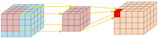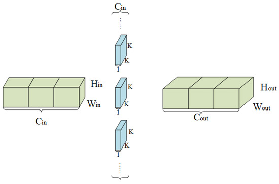 The structure diagram of TAU, depicted in Figure 1a, primarily comprises two key components. The first component is the intra-frame static attention network, which includes the small-kernel depthwise convolution (DW Conv) [28] module and the depthwise dilated convolution (DW_D Conv) module. The second component is the inter-frame dynamic attention network, consisting of the global average pooling (AvgPool) module and the fully connected layer (FC). To construct the intra-frame static attention network, we utilize DW Conv, DW_D Conv, and 1 × 1 convolution. The structure of the depthwise convolution network with small kernels is illustrated in Figure 3. In this illustration, Cin, Win, and Hin represent the number of channels, width, and height of the input image, respectively, while k indicates the size of the kernel. Conversely, Cout, Wout, and Hout refer to the number of channels, width, and height of the output image. In depthwise convolution, the convolution kernels operate independently on each input channel, rather than across channels. Each input channel utilizes a separate convolution kernel, where each kernel has a channel size of 1, and the number of kernels equals the number of input channels. The kernel size is (5.5). Following each convolution, the features are concatenated along the channel dimension to obtain the output features. The primary advantages of small-kernel depthwise convolution include high computational efficiency, fewer parameters, and a significant reduction in the computational and parameter load of the convolution layers, while still effectively extracting spatial features from each channel.