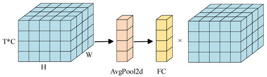 The intra-frame static attention network, by itself, is inadequate for effectively capturing the temporal dynamics along the time axis. To remedy this limitation, the inter-frame dynamic attention network employs AvgPool to extract comprehensive spatial information from each channel while simultaneously reducing the spatial dimensions of the feature map, thereby preserving the average value of each channel. Following this, FC is implemented to ascertain the significance weights of each channel. The resultant channel weights are then multiplied with the original input feature map to modulate the intensity of the features associated with each channel. This squeeze-and-excitation mechanism significantly enhances the network’s capability to learn the temporal evolution of the input sequence, thereby augmenting its proficiency in capturing temporal correlation features. See Figure 4 for an illustration of the intra-frame static attention network structure. T rep-resents the sequence length of the input image, while C, W, and H indicate the number of channels, width, and height, respectively. Merging the T and C dimensions helps the model learn temporal correlations in the input sequence more effectively.