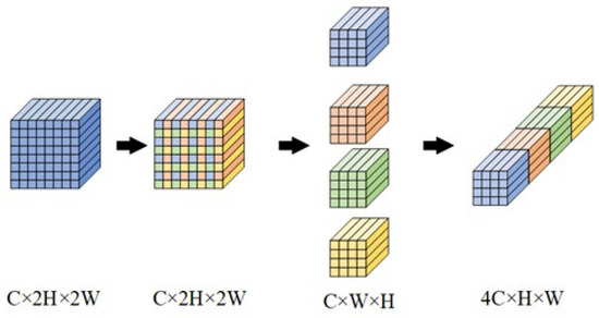 The S2D algorithm performs downsampling of image features by leveraging the spatial similarity of adjacent pixels. As depicted in Figure 5, the S2D method divides the image into multiple 2 × 2 sub-regions and allocates the four pixels from each sub-region to four separate channels in a depthwise-connection manner. By rearranging the elements of the feature map, this algorithm effectively transforms spatial information into the depth (channel) dimension, facilitating downsampling without any loss of information. This technique preserves all the data within the channel dimension, mitigating the information loss typically associated with conventional downsampling methods. Additionally, the implementation of the S2D algorithm enhances image feature extraction, yielding richer and more precise information for the model. As a result, this contributes to improved prediction accuracy and precision for the generator when analyzing radar echo images.