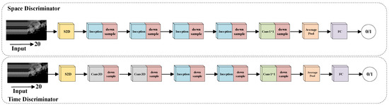 The network architecture and data flow for the temporal and spatial discriminators are illustrated in Figure 6. Initially, the discriminator receives 20 consecutive single-channel radar echo images, each with dimensions of 128 × 128, resulting in an input data shape of (20, 1, 128, 128). Subsequently, the discriminator network conducts spatiotemporal feature extraction on these data and generates a classification result. In the scenario where the last 10 frames of the 20-frame image sequence consist of real observed images, the discriminator is expected to output 1. Conversely, when the last 10 frames are images predicted by the generator, the discriminator is expected to output 0.
