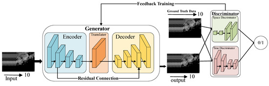 The radar echo extrapolation model delineated in this study incorporates a translator encoder–decoder framework alongside a spatiotemporal dual-discriminator conditional generative adversarial network. The specific architecture of the model is depicted in Figure 1, where it is divided into two principal components: the generator and the discriminator. Figure 1a illustrates the structure of the generator, which consists of three fundamental elements: the encoder, the translator, and the decoder. This encoder–decoder configuration is a widely utilized methodology for the analysis of sequential data or images, encompassing two primary components [22]: (1) Encoder: This component transforms input data (such as images) into a more concise vector or feature set. (2) Decoder: This component receives the concise representation produced by the encoder and converts it back into the original data format.