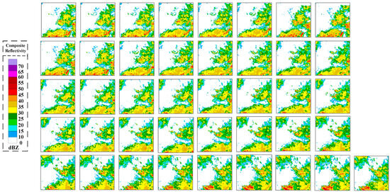 The study utilized the Guangdong–Hong Kong–Macao Greater Bay Area Radar Echo Image Dataset provided by the Shenzhen Meteorological Bureau. A pseudo-color-processed visualization sample, as depicted in Figure 9, was used. This sample comprises 41 consecutive temporal images with a time interval of 6 min between each image, covering a duration of 4 h. The images are colorized based on the radar echo intensity (DBZ) values. The conversion formula for relating radar echo intensity to image grayscale values is presented in Equation (8) [32].