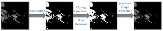 Radar echo images often contain a significant amount of noise [34] due to interactions with various obstructions in the air, such as insects and aircraft. These obstructed echoes are captured in the radar images, resulting in noise that can adversely affect algorithm performance. Consequently, quality control is typically conducted on radar echo images prior to tracking and extrapolation. Given that the echo intensity of rain clouds typically exceeds 30 dBZ, and that these cloud clusters generally do not have gaps, morphological operations are frequently utilized to eliminate holes within the radar echoes. The initial step involves binarizing the radar echo images based on the relationship between echo intensity and image grayscale values. This is followed by closing operations to effectively remove any holes within the rain cloud clusters. The specific process is illustrated in Figure 10.