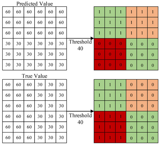 To assess the accuracy of the model’s predictions, a variety of evaluation metrics are utilized. These metrics aid in gauging the quality of the predicted images. For image prediction, metrics such as MSE, mean absolute error (MAE), SSIM, and peak signal-to-noise ratio (PSNR) [35] are employed. MSE and MAE measure the absolute pixel error between predicted and actual images, SSIM evaluates the similarity of structural information within spatial neighborhoods, and PSNR represents the ratio of the maximum possible power of a signal to the power of distortion noise. In the field of meteorology, evaluation metrics such as POD, false alarm rate (FAR), and CSI [32] are relied upon. These metrics are calculated by first setting a precipitation threshold, and then classifying grid points within and outside the threshold in both predicted and actual images as rain points (marked as 1) and no-rain points (marked as 0), respectively. For example, when the threshold is set to 40, the processing method is as illustrated in Figure 11.