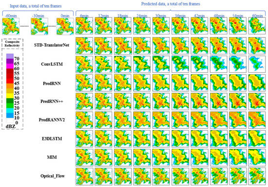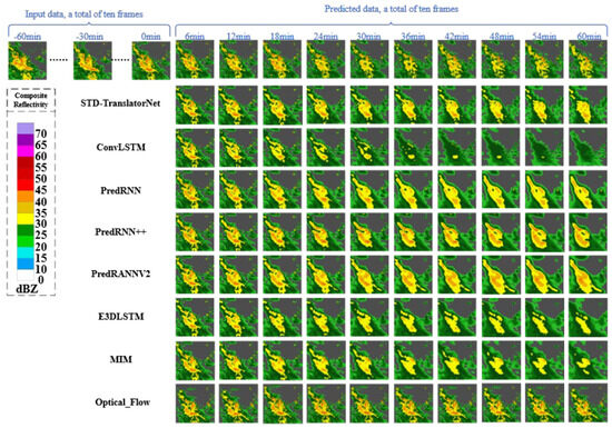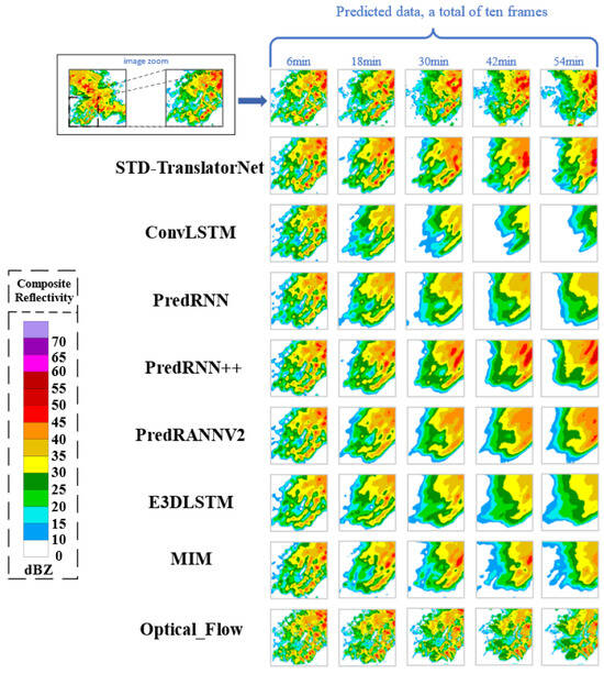 The STD-TranslatorNet model demonstrates exceptional performance in accurately predicting strong echo regions over extended time sequences. Visual samples in Figure 13 clearly show that the model’s predictions of strong echo intensity regions outperform those of other models. When compared with the true images in the first row, the STD-TranslatorNet model effectively preserves the features of strong echo areas in its predictions. Notably, as the prediction sequence lengthens, these observations become more pronounced. This trend is also supported by the data in Table 3 and Table 4, where the decrease in CSI and POD metrics with increasing time sequence frames is less pronounced for the STD-TranslatorNet model compared to other models. This highlights the model’s ability to maintain strong predictive performance even in long sequence predictions. When comparing traditional prediction methods like optical flow, it is evident from Figure 12 that images predicted using optical flow suffer from significant distortions. In particular, the anticipated movements of the cloud layer do not correspond with the actual trends observed in radar echo images. Moreover, there are considerable inaccuracies in predicting areas of radar echo intensity, with instances where low-intensity (blue) regions are mistakenly identified as high-intensity (red) areas. In contrast, our model’s predictions generally align well with the actual trends in radar echo movement and accurately represent the true conditions of echo intensity. However, relative to optical flow, our model’s predictions do exhibit some loss of detail in radar echo patterns, resulting in a somewhat blurrier depiction of echoes.