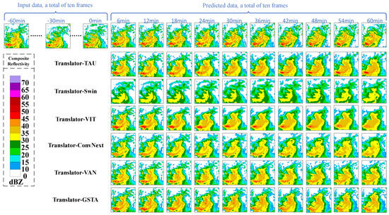 In order to further assess the performance of the proposed model and gain deeper insights into the impact of the TAU translator module on spatiotemporal prediction, five groups of translator replacement validation experiments were carried out using representative spatiotemporal prediction modules. To achieve this, sample results were visualized, as depicted in Figure 15, and line graphs and box plots of the CSI, FAR, and POD metrics at 30 dBZ were generated, as showcased in Figure 16, Figure 17 and Figure 18. In these figures, Translator-TAU represents our model, Translator-Swin denotes the model utilizing the Swin module based on Transformers, Translator-VIT corresponds to the model using the vision-transformer-based VIT module, Translator-ConvNext refers to the model employing the modern convolution-based ConvNext module, and Translator-VAN indicates the model utilizing the visual-attention-network-based VAN module. Additionally, Translator-GSTA represents the model utilizing a gated spatiotemporal attention mechanism based on spatial attention and multilayer perceptions. The conclusions are summarized as follows: