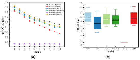 POD metric line chart and box plot of 10-frame prediction images for translator replacement experiment at 30 dBZ: (a) POD metric line chart of 10-frame prediction images; (b) POD metric box plot of 10-frame prediction images.