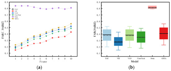 FAR metric line chart and box plot of 10-frame prediction images for translator replacement experiment at 30 dBZ: (a) FAR metric line chart of 10-frame prediction images; (b) FAR metric box plot of 10-frame prediction images.