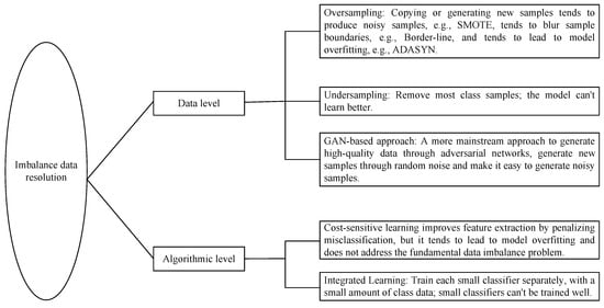 Solving the learning and classification problem for unbalanced data is shown in Figure 1. The relevant research programs can be explored from two directions. (1) Algorithm level: Algorithm-level methods focus on minority class samples by modifying classifiers, setting weights, improving loss functions, etc. Or, adjust the training process of the model through the penalty mechanism and improve the training strategy for small class samples. However, these methods lack flexibility and are prone to overfitting of the model. (2) Data level: The main methods include undersampling and oversampling [7], and hybrid sampling that combines these two sampling methods. These methods start from the perspective of data and use various methods to achieve a theoretical balance of various types of data, thereby solving the problem of unbalanced data. These methods are efficient and easy to understand, and they can also retain the original feature information of the data. Oversampling is considered to solve the problem of data imbalance.