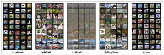 Figure 6 shows the oversampling effect of different methods in the CIFAR-10 image dataset, which we analyze in comparison with the BANG, GAMO, and DeepSmote methods. The BANG method generates a very blurry image with misalignments between pixels in the image. The GAMO method eliminates pixel misalignments in the image. However, it generates a more blurry image, which makes it difficult for the eye to recognize the category of each image, which makes it difficult for the classifier to learn the image features. DeepSMOTE effectively improves the quality of image synthesis because of its efficient encoding/decoding structure with an enhanced loss function. However, compared to our method, some of the images in the DeepSMOTE method are blurred, and our images are more explicit in synthesized images and more similar to the original images.