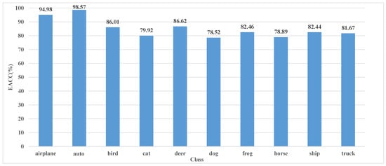 To verify the performance of our scheme on the samples of each category, we adjust the imbalance ratio of the CIFAR-10 dataset to 50, and the numbers of each category are 5000, 3237, 2096, 1357, 878, 568, 368, 238, 154, 100. The aeroplane class is a majority class sample with 5000 samples, and the truck class is a small sample with 100 samples. After 200 epochs of training, the EACC of each category in the dataset is shown in Figure 7.