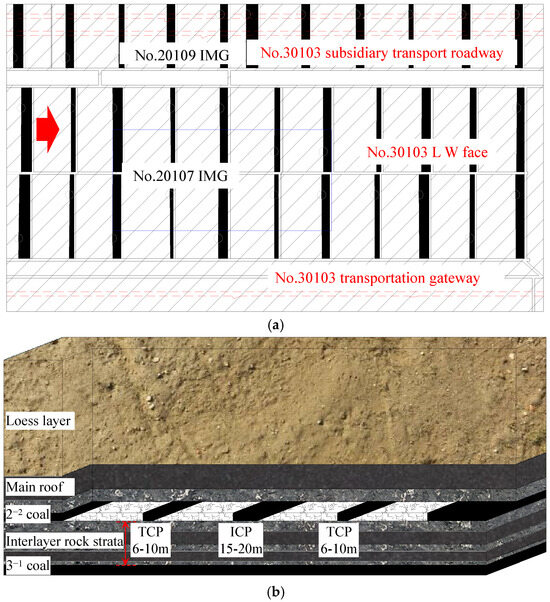 Figure 1. Coal pillar distribution plan of the overlying interval goaf at the 30,103 working face. (a) Local plan of the 30,103 working face. (b) Local sectional view of the 30,103 working face.