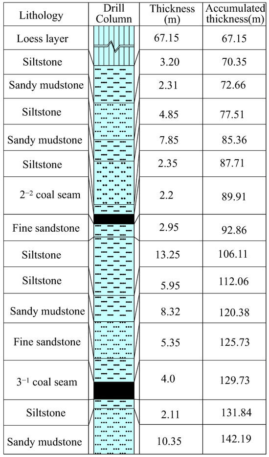 The 30,103 working face of the Nanliang Coal Mine in Northern Shaanxi mining area is located at a depth of 130 m, with a bedrock thickness of 63 m and a loose layer thickness of 67 m. The 3-1 coal seam is 4 m thick. The 2-2 coal seam, which is 2.2 m thick, is situated at a depth of 97 m. It is underlain by a 25 m thick bedrock layer and overlain by an 8.5 m thick weathered rock layer. The interlayer spacing between these two coal seams is 30 m. The interlayer rock strata (IRS) primarily consist of siltstone, fine sandstone, and sandy mudstone. The 2-2 coal seam employs an interval mining method, while the 3-1 coal seam utilizes longwall mining. The spatial relationship and distribution of these two coal seams are illustrated in Figure 1 and Figure 2.