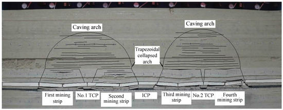 Reference [33] discussed the interval mining method of the 2−2 coal seam and the stress variation characteristics of the RCPs in the interval goaf were discussed. In the early stage of the formation of the interval goaf, the immediate roof strata caved as mining proceeded, while the main roof rock strata remained stable. Over time, the load on the TCPs exhibited an overall trend of “uniform increases—accelerated accelerates—sudden instability”. Due to the narrow width of the TCPs, they experienced creep under the concentrated load, which gradually degraded their load-bearing capacity. Eventually, the TCPs experienced sudden instability, thereby triggering fractures and instability of the main roof rock strata in the interval goaf. Following the fracturing of the roof OR in the mining strip, these combined with the soil caving arch to form a “trapezoidal-semicircular arch” fissure zone, which created conditions conducive to mining under the interval goaf of the lower coal seam, as presented in Figure 4.