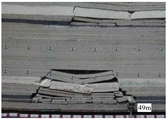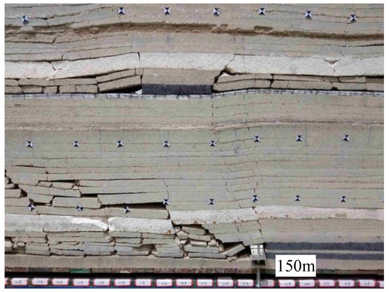As the working face advanced to the middle and rear parts of the ICP, the load supported by the double-arch bridge structure in the goaf roof of the upper coal seam was transmitted to the IRS via the ICP. With continuous advancement of the working face, the effective bearing area of the IRS under the ICP decreased, while the load per unit area on the IEBS increased. When the working face was 7 m past the ICP, as shown in Figure 11b, the actual load per unit area on the IEBS exceeded the limit strength of its cantilever structure. This resulted in an overall cutting failure along the coal wall of the working face, with a cutting angle of approximately 75°, thereby leading to a sudden increase in support resistance. Meanwhile, as the double-arch bridge structure of the ICP rotated toward the goaf side, the hinged arch beam structure on the right side of the ICP experienced reverse rotational instability. Consequently, the entire OR underwent rotational deformation toward the goaf side, and noticeable vertical tensile cracks appeared on the surface ahead of the working face. The mining-induced shear and tensile cracks that formed on both sides of the OR of the ICP gradually closed as the double-arch bridge structure became unstable.