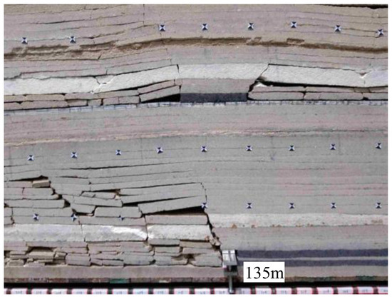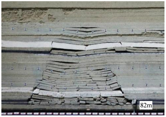 A 15 m boundary coal pillar was retained in the model. As displayed in Figure 5, when the working face advanced to 49 m, the lower key stratum (LKS) experienced sliding instability behind the support. The caving height of the goaf roof rock strata reached 12.9 m, exhibiting a “trapezoidal” shape. As presented in Figure 6, the working face advanced to 82 m, it was 7 m past the 1# unstable TCP. After moving the support, the LKS experienced reverse rotation and sliding instability, while the upper key stratum (UKS) fractured forming a hinge structure. This caused the hinged goaf roof rock blocks in the upper coal seam to rotate and sink, while secondary instability occurred in the OR structure, leading to a further expanded caving range. The support resistance reached 8200 kN.