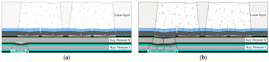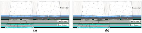 Figure 16. The overburden rock caving of the working face through the ICP. (a) The sixth periodic weighting. (b) The seventh periodic weighting.