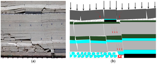 Figure 10. Fracture characteristics of the IEBS during mining under the stress release zone. (a) Fracture of the interlayer lower bearing stratum. (b) Fracture of the interlayer upper bearing stratum.