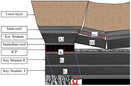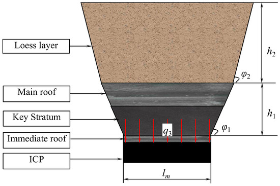 where γ0h0 is the self-weight load of the immediate roof, which is 0.042 MPa; γ1h1 is the self-weight load of the OR, which is 0.736 MPa; γ2h2 is the self-weight load of the overlying soil, which is 1.206 MPa; φ1 and φ2 are the fracture angles of the rock and soil layers, respectively. Based on the rock layers in the Yushenfu mining area, φ1 and φ2 were taken as 67° and 80°, respectively. Based on the parameters of overburden rocks and soils in the Nanliang Coal Mine, the equivalent uniform load q3 on the ICP was calculated to be 4.69 MPa, with a stress increase coefficient of 2.36.