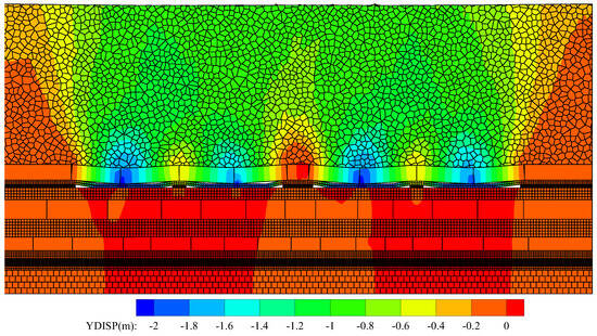 According to the geological conditions of the Nanliang Coal Mine, a numerical simulation model was established using the discrete element UDEC 5.0 simulation software [39,40,41,42,43,44] to investigate the instability characteristics of the IEBS during mining passing through the double arch bridge structure of the ICP. The analysis focused on the fracture and instability patterns of IRS during mining in the lower coal seam. As shown in Figure 15, the simulated thickness of the 2-2 coal seam was 2 m, while the thicknesses of the immediate and main roofs were 2 m and 8 m, respectively, where a longwall interval mining method was employed. The 3-1 coal seam has an average depth of 132 m, a bedrock thickness of 65 m, and a loose layer thickness of 67 m. The simulated thickness was 2.2 m, and a fully mechanized longwall mining method was employed. The average interlayer spacing between the two coal seams was 34 m. The model parameters were adjusted based on laboratory tests of the physical and mechanical properties of the coal rock. The block body followed the Mohr–Coulomb criterion, while the joint surfaces adhered to the Coulomb slip failure criterion. The model dimensions are 300 m in length and 147 m in height, with the top surface as a free face and fixed boundary conditions on the left, right, and bottom sides. A 15 m boundary coal pillar was retained on both sides of the mining model for the 3−1 coal seam, and the model was mined sequentially from left to right, with a mining interval of 2 m.