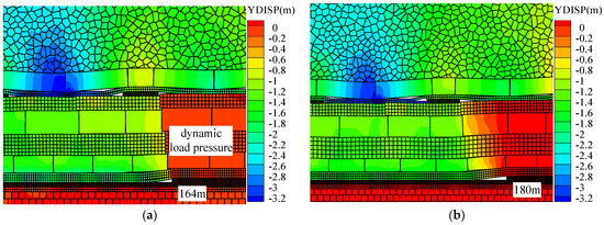 As the working face advanced to 164 m, the sixth periodic weighting occurred, with an interval of 17 m, as illustrated in Figure 16a. The working face was 6 m away from the boundary of the ICP, and shear failure occurred in the OR along the support. The roof subsided by 0.69 m, and the support resistance increased sharply, leading to dynamic mining pressure in the working face, with a dynamic load factor reaching 1.83. The analysis indicated that during mining in the lower coal seam, the two interlayer key strata primarily controlled the OR. The ICP bore a significant concentrated load from the OR. The thickness of the IEBS ranged from 17.49 to 18.42 m. Due to the influence of the fracture angle of the rock layers, the caving of the IRS lagged behind the working face by 7 to 9 m. When the working face left the boundary of the ICP, the effective bearing area of the IEBS above the support gradually decreased, which made it difficult for the cantilever beam structure of the IEBS to support the concentrated stress transmitted from the OR. Cutting failure occurred along the coal wall of the working face forming a cutting failure zone from the coal wall to the boundary of the ICP. Simultaneously, as the ICP experienced roof caving failure, the fractured rock blocks on the right side of the double-arch bridge structure rotated backward toward the goaf, which exacerbated the caving of the roof rock strata. When the working face continued to advance to 180 m, the seventh periodic weighting with an interval of 16 m occurred while it was in the third mining strip, as shown in Figure 16b. The interlayer LKS and its accompanying rock layers rotated upward toward the goaf, forming a separation with the UKS. The separation spanned 12 m, with a maximum separation distance of 0.4 m.