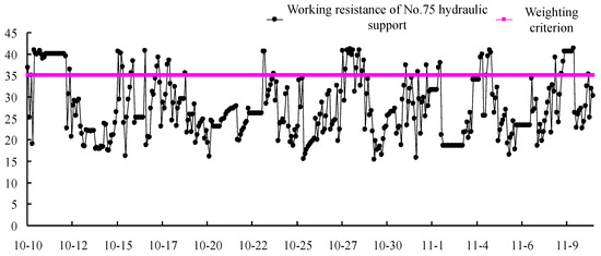 To address the aforementioned dynamic pressure issues, a comprehensive prevention and control strategy involving pre-releasing concentrated stress in the ICP, strengthening the support strength of the working face, and accelerating the advancement speed was proposed. Following the selection of the ICP for loosening and pre-splitting, a loosening blasting was implemented for the ICP in the range of 900 to 1200 m in the 30,103 working face from 10 October to 13 November 2019. The changes in the working resistance of the No. 75 support during mining through this section were monitored, as shown in Figure 17. During the mining process, the immediate roof subsided with the advancement of the working face, leading to the gradual formation of separation and the caving of the OR in the goaf roof. The mining pressure in the working face exhibited alternating small and large periodic weightings, with an average interval of 13 m for small periodic weighting and 19 m for large periodic weighting. The average working resistance of the support during non-weighting was 28.7 MPa, while those during small and large periodic weightings were 37.5 MPa and 32.9 MPa, respectively. The average dynamic load factors during periodic weighting were 1.3 and 1.15 MPa. After the pre-splitting blasting of the ICP, when the working face left the double-arch bridge structure of the ICP, the maximum pressure on the support reached 43 MPa. The volume of coal wall spalling decreased, the safety valve opening rate of the support reduced, and the mining pressure appeared to be alleviated. This indicated that the pre-splitting blasting released the stress concentration in the ICP, reduced the hanging height of the hinge rock blocks in the double-arch bridge structure, and effectively mitigated the dynamic load impact caused by the instability of the double-arch bridge structure in the working face of the lower coal seam.