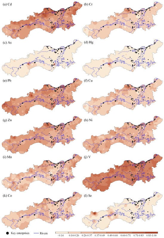 The spatial distribution of the concentrations of heavy metals and distribution of key enterprises. (In the figure, (a) represents the spatial distribution of Cd, (b) represents that of Cr, (c) represents that of As, (d) represents that of Hg, (e) represents that of Pb, (f) represents that of Cu, (g) represents that of Zn, (h) represents that of Ni, (i) represents that of Mn, (j) represents that of V, (k) represents that of Co, and (l) represents that of Se.).