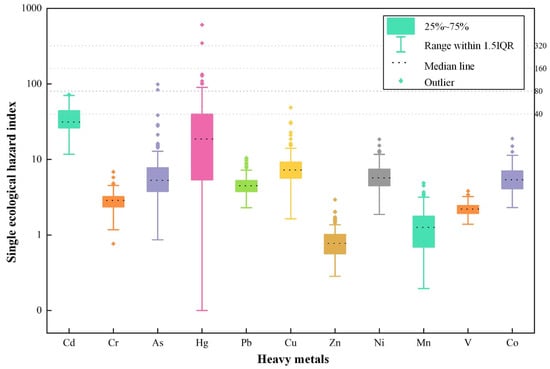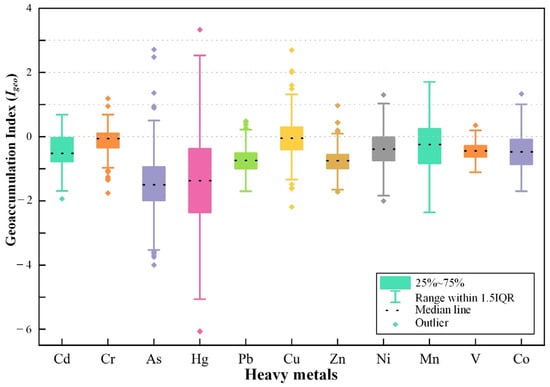 To visually present the pollution status of different heavy metals in the soil, the Igeo evaluation results for the study area are depicted as a boxplot. As can be seen from Figure 3, the pollution levels of eight heavy metals, including Cd, As, Hg, Pb, Zn, Ni, V, and Co, are relatively low, with more than 75% of the sampling points considered to be uncontaminated. The remaining heavy metals, Cr, Cu, and Mn, exhibit a broader range of pollution levels, all falling within the light to moderate pollution category. However, due to the varying degrees of toxicity caused by different heavy metals, it cannot be denied that the presence of excessively high outlier values for highly toxic heavy metals such as Hg poses significant ecological pollution hazards. Therefore, it is necessary to assess the ecological hazards of heavy metals in the soil.