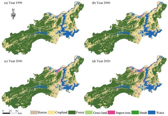 Map of changes in land use type for the study area in 1990, 2000, 2010 and 2020 [] (In the figure, (a) represents the land use data for the year 1990, (b) for the year 2000, (c) for the year 2010, and (d) for the year 2020).