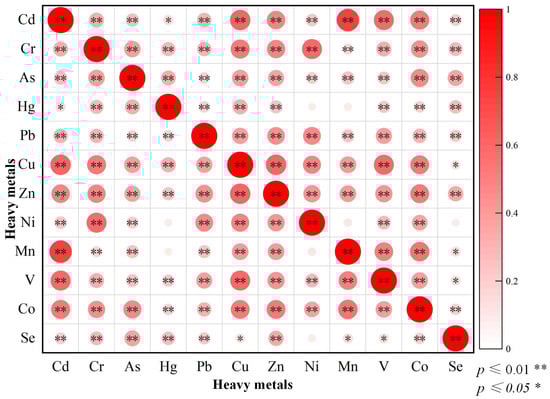 Correlation analysis of heavy metal elements in the study area’s soil.