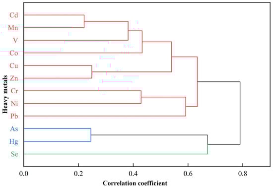 Cluster analysis is a powerful tool for identifying sources of heavy metal pollution. It helps reveal similarities and differences between different soil heavy metals, thereby pinpointing potential pollution sources [,]. In the dendrogram of the cluster analysis, the distance represents the correlation between different heavy metals; the closer the distance, the more significant the correlation, implying a similar source. The cluster analysis results for various heavy metals in the study area’s soil are shown in Figure 8. Cd, Mn, V, Co, Cu, and Zn are grouped into one category, while Cr, Pb, and Ni are grouped into another, further confirming the results of the correlation analysis.