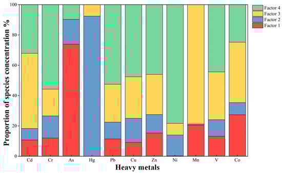 Factor 3 is predominantly weighted by Mn at 78.8%, with secondary contributions from Cd at 49.6%, Co at 39.9%, V at 31.6%, Cu at 27.4%, Zn at 26.5%, and Pb at 25%. Mn is a common metallic element, and numerous prior studies have indicated that the presence of Mn in soil may be controlled by the soil parent material [,]. The significant contribution of factor 1, which refers to natural sources, to Mn further supports this assertion. Thus, factor 3 is characterized as a non-natural source. Mn is widely used in industry, particularly in steel production as an alloying element to enhance strength and corrosion resistance, in batteries such as alkaline Mn batteries, and in chemical products including pigments and catalysts. [,,,,]. Zn, Pb, and Cu are typical contaminants associated with steel mills []. The secondary contributions of Cd (49.6%), Zn (26.5%), and Pb (25%) may suggest that they originate from the non-ferrous metal smelting process []. The accumulation of Cd is primarily attributed to increased industrial waste emissions, particularly from Pb-Zn mining and metal smelting, with severe Cd pollution in areas surrounding paper mills, which is a characteristic pollutant from the paper industry []. Pb, Cd, and Hg are also associated with metal casting facilities, entering the soil through atmospheric deposition of smelting fumes, leaching of industrial waste, and wastewater discharge []. Therefore, factor 3 is likely linked to these industrial activities. In summary, factor 3 is likely representative of industrial pollution sources from non-ferrous metal smelting and the paper industry.