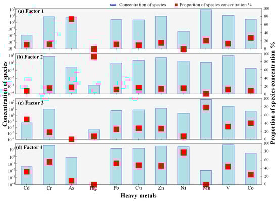 Factor loadings plot from the PMF model using soil heavy metal concentration data. (In the figure, (a) represents Factor 1, (b) represents Factor 2, (c) represents Factor 3, and (d) represents Factor 4).