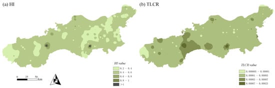 Building on the research by Hanfi et al., this study examines the impact of 11 heavy metal elements: Cd, As, Hg, Pb, Cu, Zn, Ni, Mn, V, Co, and Cr [,,,,]. Figure 11a illustrates the spatial distribution of the HI within the study area. It is generally accepted that an HI value less than 1.0 indicates no significant carcinogenic risk, although the risk level increases with higher HI values. Spatial analysis reveals that the majority of HI values range from 0 to 0.8, leading to the conclusion that there is no significant carcinogenic risk in the study area as a whole. However, two regions, located in the central-southern and central-western parts, exhibit HI values greater than 1, which is consistent with the distribution of RI values (Figure 6). Additionally, the TLCR values for Cd, As, and Pb were calculated, and inverse distance weighting interpolation was applied to map their spatial distribution across the region (Figure 11b). The results indicate a maximum TLCR value of 0.00023, suggesting that the carcinogenic risk in the study area is generally at a moderate level.