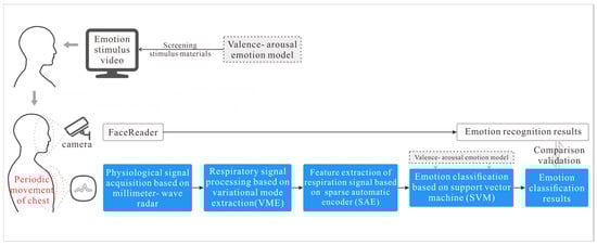 In this paper, we hypothesize that millimeter-wave radar sensors can classify individuals’ emotions by measuring their respiratory signals in conjunction with machine learning algorithms within a closed-cabin environment. To address the issue of emotion recognition for personnel in closed cabins, this study proposes a method using a millimeter-wave radar to collect respiration signals, combined with a machine-learning framework for emotion classification and recognition. First, we used a continuous-wave radar to measure the respiration signals of the participants in a closed-cabin laboratory while they watched videos designed to elicit different emotions. After processing, we obtained respiration waveforms corresponding to different emotional states. Next, we used a sparse autoencoder (SAE) to extract features from the waveforms. These features were then inputted into two support vector machines (SVMs) for arousal and valence classification. Our method was compared with the FaceReader™, a commercial emotion recognition device that uses audiovisual signals. The results indicate that our method is not only more suitable for deployment in closed cabins but also maintains accuracy and provides objective results. The overall research framework is illustrated in Figure 1.