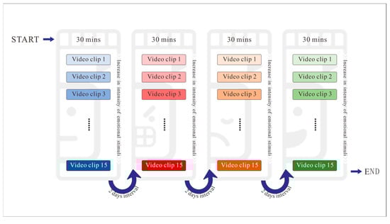 - Emotion stimulus material selection: In this manuscript, we utilize video as the emotion stimulus material; however, the literature [] offers a more effective solution by using VR scenes to evoke the corresponding emotions. This method provides a more controlled and immersive environment for emotion elicitation and assessment, leading to applications in various domains such as mental health, marketing, and entertainment.