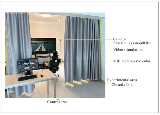 The experimental setup is illustrated in Figure 5. To test whether the methodology of this study could be applied to a closed-cabin environment, this experiment was conducted in the closed-cabin laboratory at the Department of Industrial Design, College of Electrical and Mechanical Engineering, Northwestern Polytechnical University. The laboratory is an electrically shielded and soundproof room with manually controlled light and temperature. The room temperature is set at 25 °C, and the lighting conditions are configured to 6500 K × 600 lx, which, according to a previous study [], can help create a relaxed atmosphere. The experimental steps and details were explained to all participants prior to the experiment, and written informed consent was obtained from all participants, who were assured that the data obtained from this experiment would not be used for other purposes. The experiment was approved by Northwestern Polytechnical University (No. 202202053) and complied with the Declaration of Helsinki.