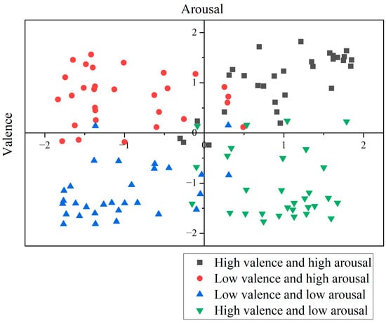 For each video, normalized arousal and valence scores were calculated by dividing the mean rating by the standard deviation. We then selected the 15 videos closest to the polar extremities in each quadrant of the normalized valence–arousal space, as illustrated in Figure 6. During the experiment, the videos were played in an order designed to enhance the emotional effect, which continuously and effectively stimulated the participants throughout the process. To avoid potential bias, the participants were not informed in advance of the type of video they would watch. Each test session was approximately 30 min.