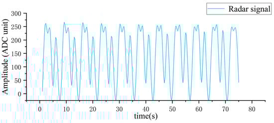 The principle of bio-signal detection with millimeter-wave radar relies on the Doppler effect, where the received signal reflects distance variations between the radar antenna and the participant’s chest wall, driven by cardiac and respiratory movements. The radar continuously emits a digitally generated sinusoidal carrier wave, and for objects with periodic motion, the radar receiver component receives echoes that vary periodically over time. This characteristic makes it possible to detect vital signs such as the periodic movement of the chest caused by breathing or heartbeats, from which physiological information such as heart and respiration rates can be extracted [].